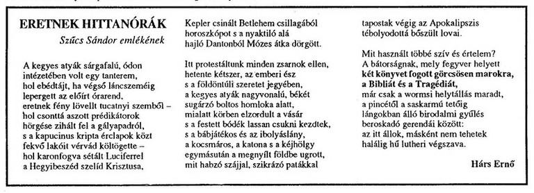 Így emlékezik meg Szücs Sándor volt magyaróvári lelkészről gyülekezetének egyik tagja és volt tanítványa Hárs Ernő, Eretnek Hittanórák című költeményében. És valóban a Bibliából fakadó mélységes hitén és a Madách váteszi filozófiáján alapult Szücs Sándor egész lénye, lelkivilága és gondolatmenete.